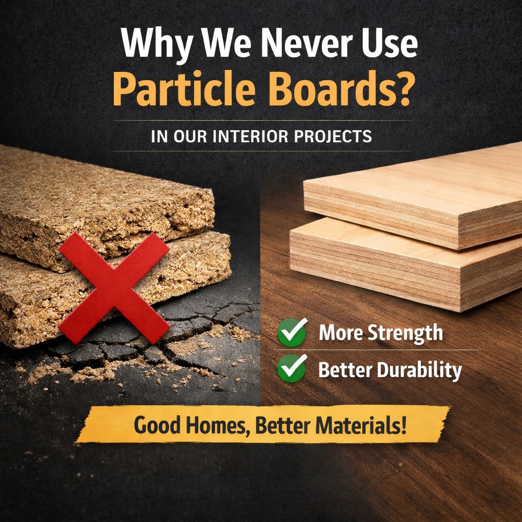 When planning home interiors in Kerala, material selection plays a critical role in durability and long-term performance. While some interior companies use particle boards to reduce costs, we believe premium homes deserve stronger and more reliable materials.