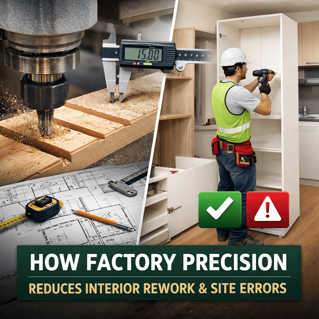 Interior mistakes during site installation can increase cost, delay handover, and reduce finish quality. That’s why modern homeowners and architects in Kerala are shifting towards factory-made interior solutions.