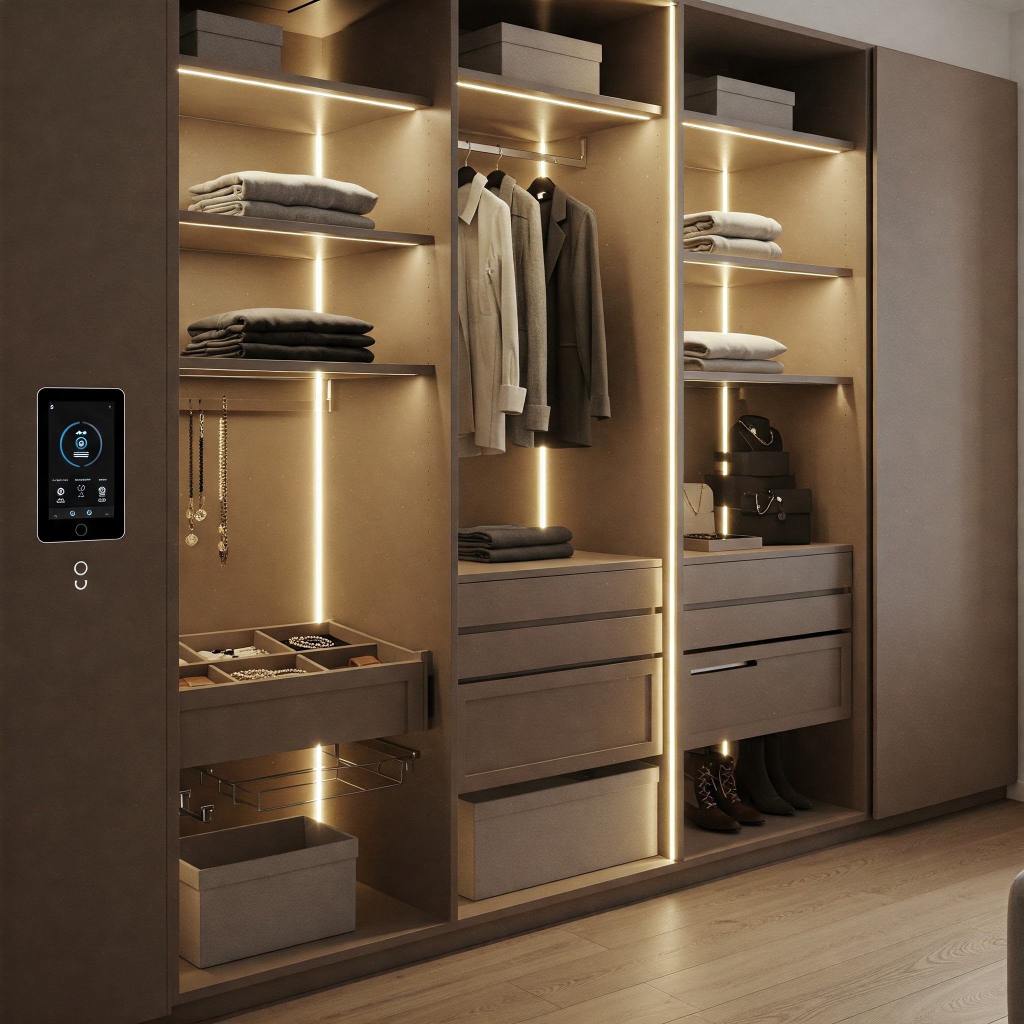6. Intelligent Wardrobes with Inbuilt Lighting and Accessories