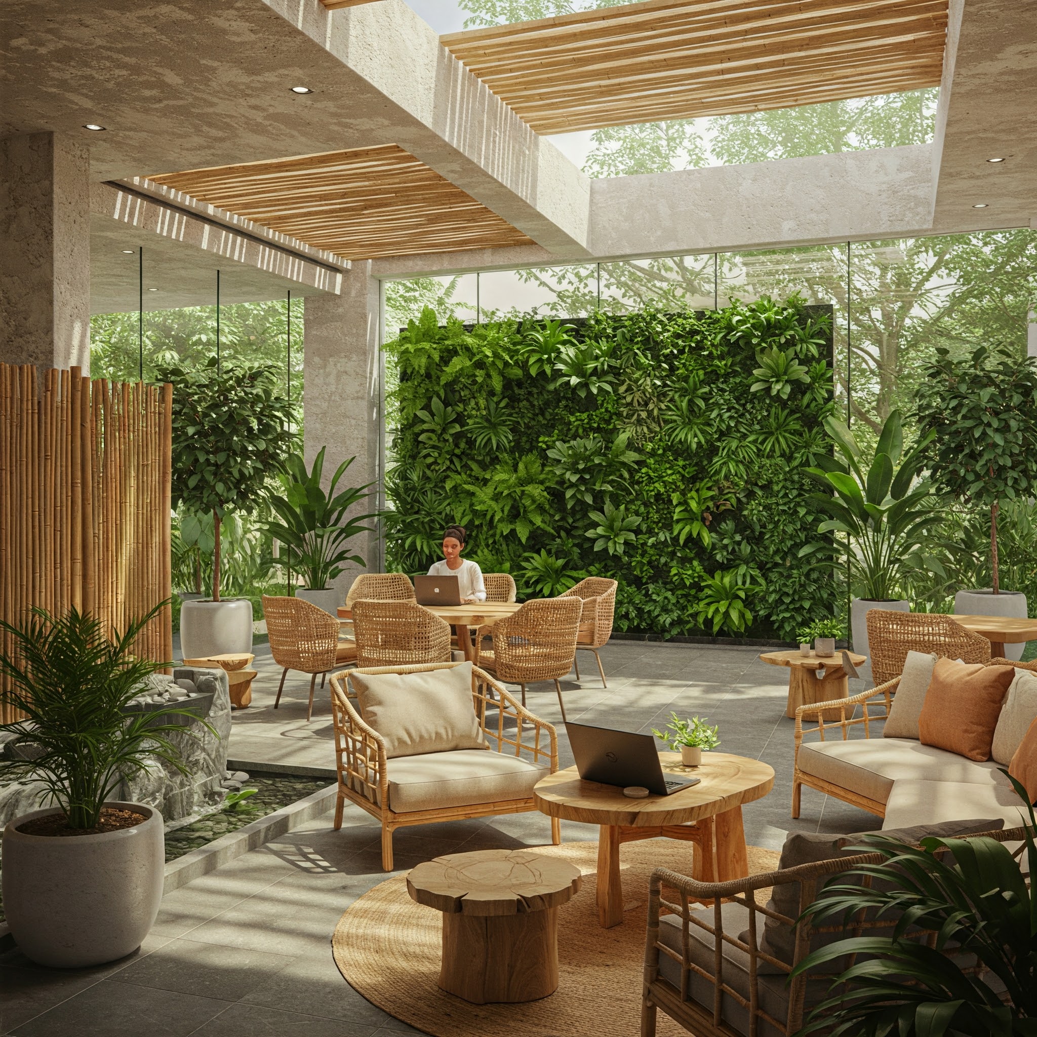 Natural textures and materials: Wood, stone, and greenery create a refreshing work atmosphere.