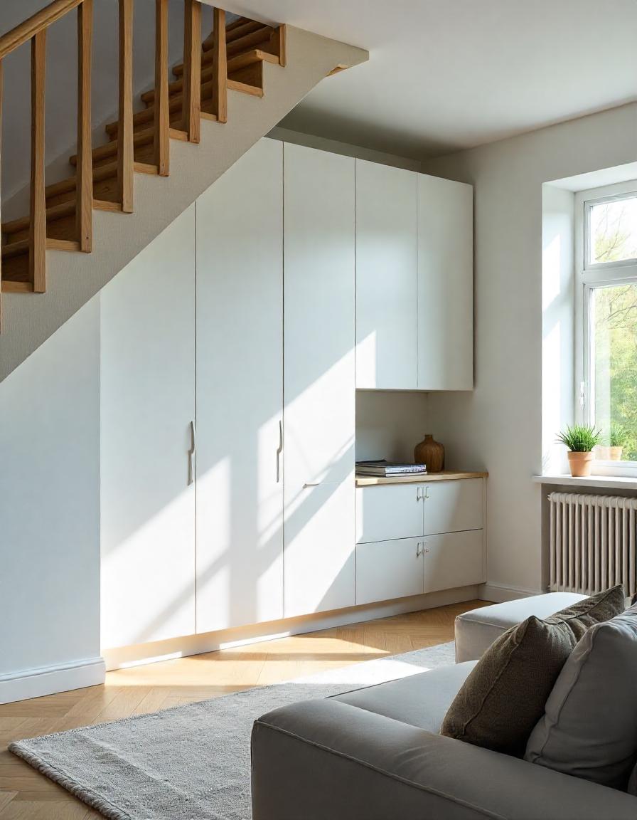 Under the stairs: Create drawers, bookshelves, or even a mini workstation.