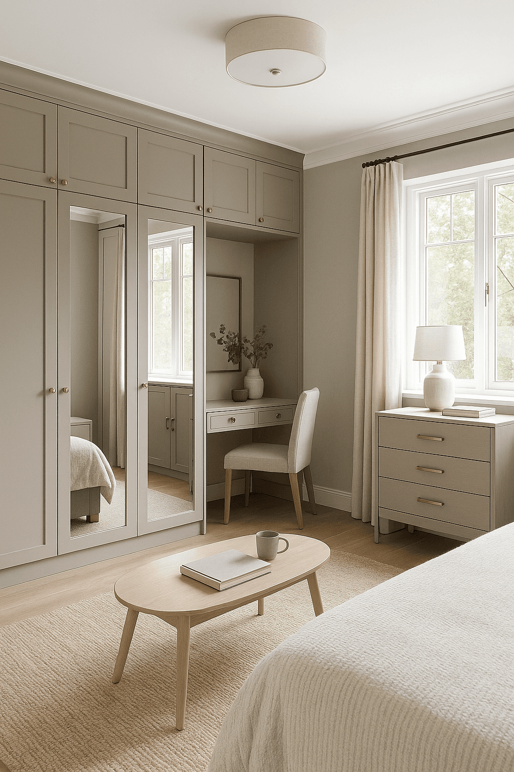 We often incorporate mirror panelling, mirrored wardrobes, or even tinted glass to subtly open up rooms. In one compact living room, we added a full-length mirror on a wardrobe shutter, instantly making the space feel double in size.