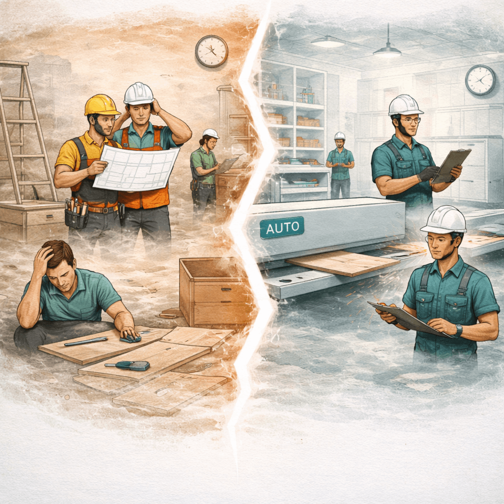Traditional interior work carried out on-site relies heavily on manual labor. The final outcome depends on individual skill levels, working conditions, and coordination between different teams. This often leads to inconsistencies in the final finish.